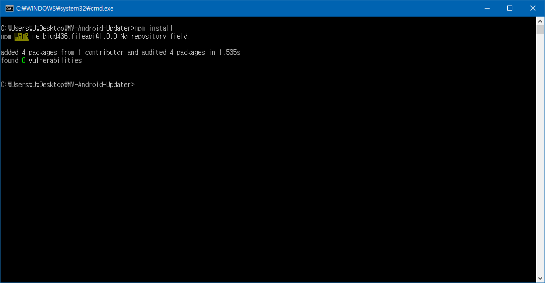 실시간 업데이트는 노드 패키지 관리자(npm)에서 코르도바와 기타 여러가지 코르도바 플러그인을 설치해야 동작한다. 따라서 컴퓨터에 Node.js가 설치되어있어야 한다. 이 포스트를 읽는 사람들 중에 혹 Node.js가 아직도 설치되어있지 않은 사람들이 있을 거라고 믿고 싶진 않지만 다운로드는 https://nodejs.org/ko/download/에서 할 수 있다. 다운로드 후 설치가 끝났으면 실행에서 cmd을 입력하면 명령 프롬프트가 실행된다.